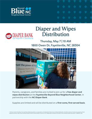 Parents, caregivers, and families are invited to join us for a free diaper and wipes distribution at the Fayetteville Beyond Blue Center.