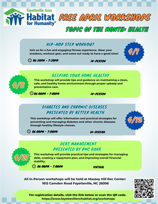 Come to learn and enjoy FREE workshops sponsored by Fayetteville Area Habitat for Humanity. This month, April, is all about HEALTH. Register here for one day or all.