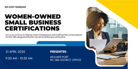 Join us as we focus on helping women entrepreneurs and small business owners prepare for their SBA designated Women-Owned Small Business certification. Designed to help “level the playing field”, the WOSB program offers entrepreneurs in certain industries to enter the federal marketplace with the benefit of limited competition. Whether you’re just starting, or looking to expand your business, this session will provide valuable insights on the WOSB program and how it can take your business to the next level!